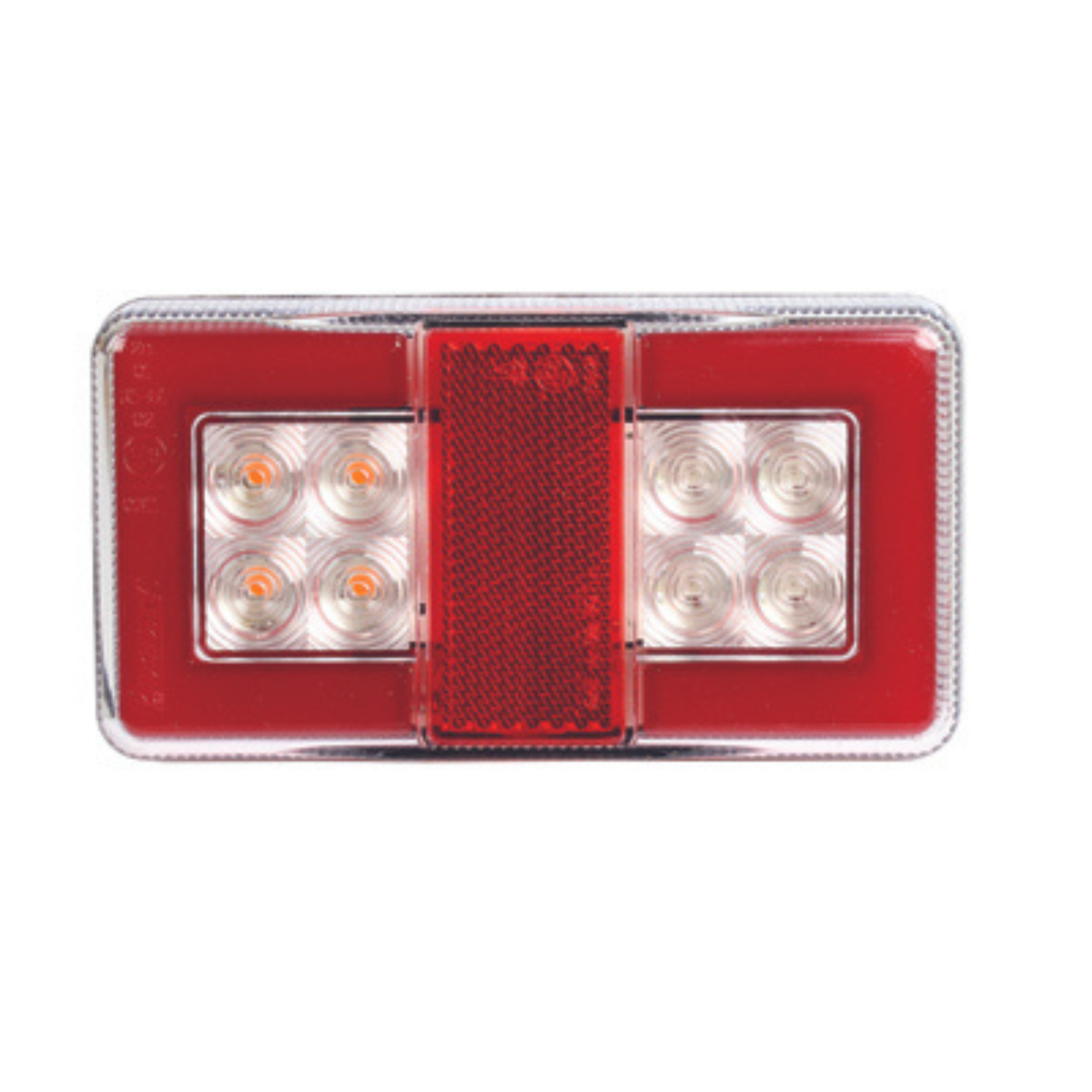 Dual Voltage Glo Trac LED Universal Rear Light Cluster for improved Vehicle Visibility. Combination Lamp functions include Stop, Tail, Indicator and Reflex Reflector. Highly consistant illumination with a distinctive appearance.