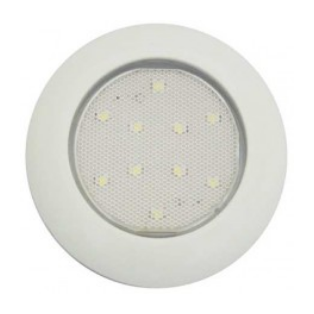 Slim 12V/24V LED circular interior lamp. 10 SMD LEDs, 665 Lumens. Surface mounting white plastic bezel. Protected to IP67. EMC R10 approved. Diameter 75mm, depth 8.7mm