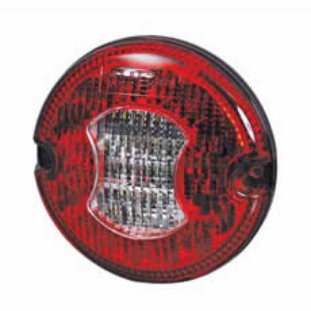 Tail/fog/reverse 12/24V LED rear lamp. Supplied with 500mm flying leads. 95mm diameter. 2 x M8 fixing bolts. Acrylic lens and polycarbonate housing. ECE approved. Protected to IP67.