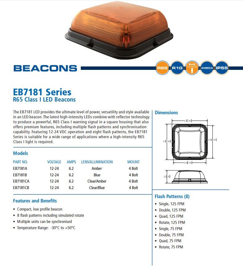 | EB7181A | 12/24V | 6.2A | Amber 4 Bolt |
